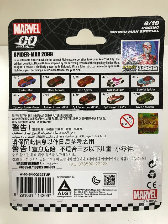مجموعة من 10 سيارات لعبة دييكاست. - تشمل جميع سبايدر مان ومايلز موراليس وأيرون سبايدر وجوست سبايدر و سكارليت سبايدر و سايبورغ سبايدر مان و سبايدر ارمور و سبايدر مان 2099 و جرين ستيلث. - مقياس 1:64. - مناسب للأعمار من سن 3+ سنوات وما فوق .