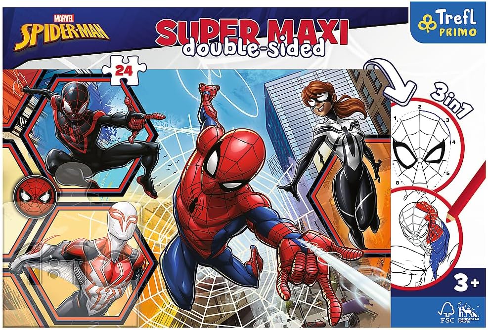 بازل أطفال بتصميم Spider-Man، مكوّن من 24 قطعة كبيرة (Super Maxi) سهلة التركيب، ويتميز بأنه دابل سايد (وجهين) مع أكثر من نشاط رسم وتلوين 3 في 1. مناسب للأطفال من عمر 3 سنوات، ويساعد على تنمية التركيز، الخيال، والمهارات الحركية الدقيقة بطريقة ممتعة.