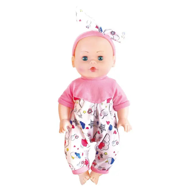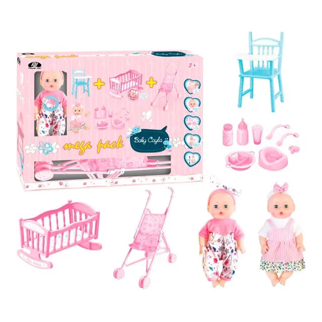 تحتوي المجموعة على دمية تصميم جميل بطول 31 سم وعربية للدمية وكراسي وسرير وملحقات للشرب. عينان وابتسامة واقعية لتكون رفيقة طفلتكِ المقربة. اضغطي لتستمتعي مع 4 أصوات واقعية لمتعة لا نهاية لها. تعمل بالبطارية متوفرة بتصميمين وسيتم إرسال التصميم المتوفر.