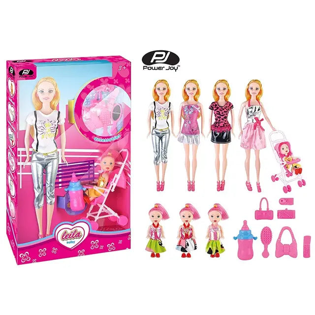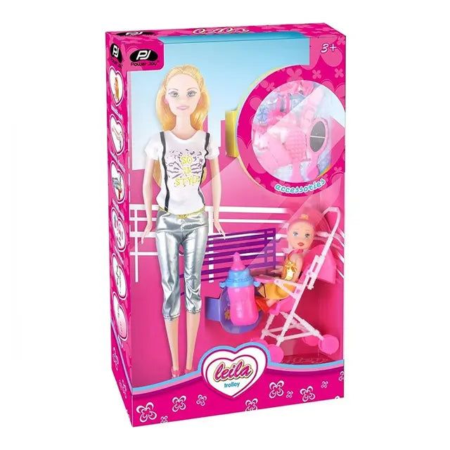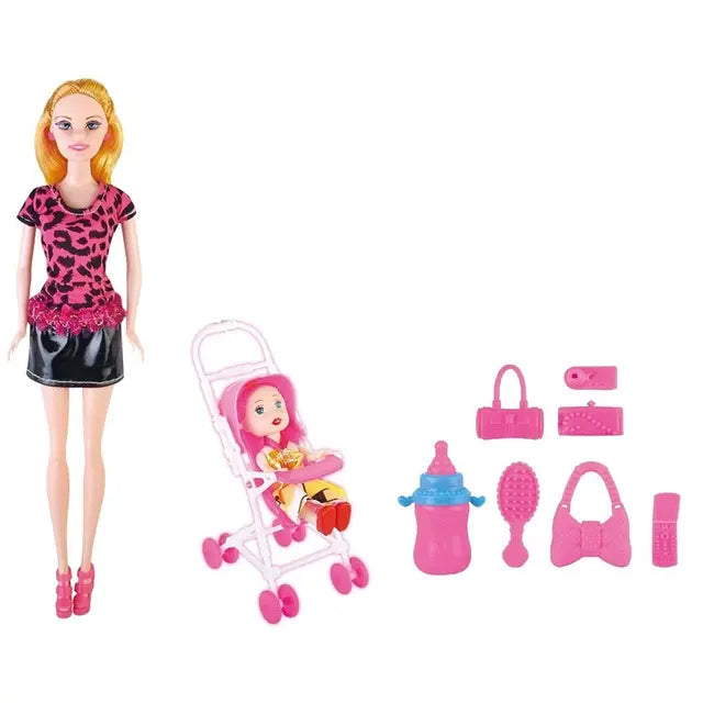 يرجى ملاحظة: قد تختلف أنماط ولون العنصر المستلم حسب التوافر. - دمية الموضة الجديدة مقاس 31 سم مع عربة ودمية أطفال وإكسسوارات التجميل. - مصنوع من فينيل معتمد بسطح منحنيات أملس وغير سام وآمن للعب سترتدي الفساتين الملونة والجميلة ذات الطراز الجديد وتلبس بسهولة أكبر.