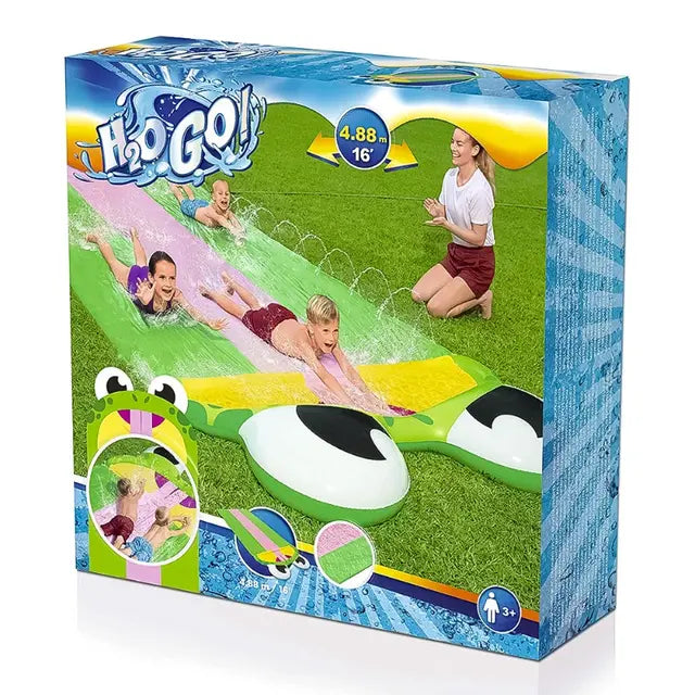 زحلاقية مائية أرضية اتش تو اوه جو شكل ضفدع 488 سم من بيست واي. - زحلاقية المسار السريع مثالية للسباقات المائية ولمرح الاطفال. - يتم تصريف المياه من خلال صمام الدخول وصمام الصرف أسفل وسادة الرش. - اطفالك سوف يستمتعون بالقفز السريع أو القفز و الانزلاق أو الاستلقاء على الزحليقة لمزيد من المرح. - الابعاد التقريبية:481 × 132 × 35 سم. - الفئة العمرية المناسبة: 3 سنوات فما فوق.
