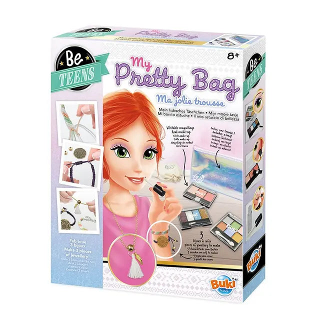 - مجموعة تحتوي على مكياج وإكسسوارات حقيقية لصنع 3 قطع من المجوهرات. - اتبعي التعليمات لصنع سوارين وقلادة. ثم احتفظ بها في الحقيبة الصغيرة. - تتضمن أيضًا لوحتين لظلال العيون، بما في ذلك لوحة لامعة ولوحة أحمر الخدود وملمع شفاه لامع. - قم بتخزين مكياجك ومجوهراتك في الحقيبة وخذها معك في كل مكان. - ورقة التعليمات مع الرسوم التوضيحية الملونة. - الفئة العمرية المناسبة: 8 سنوات.