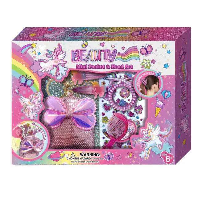 - تحتوي المجموعة على: حقيبة مزخرفة بالترتر وقوس والتي يمكن أن تكون أيضًا سلسلة مفاتيح و 2 دبابيس شعر يونيكورن و مشط و رباط مطاطي للشعر و ورقة ملصقات. - حقيبة مميزة لحفظ أغراضك و أخذها معك. - أبعاد العلبة: 29 × 22 × 5.5 سم. - الفئة العمرية المناسبة: 3 سنوات فما فوق.