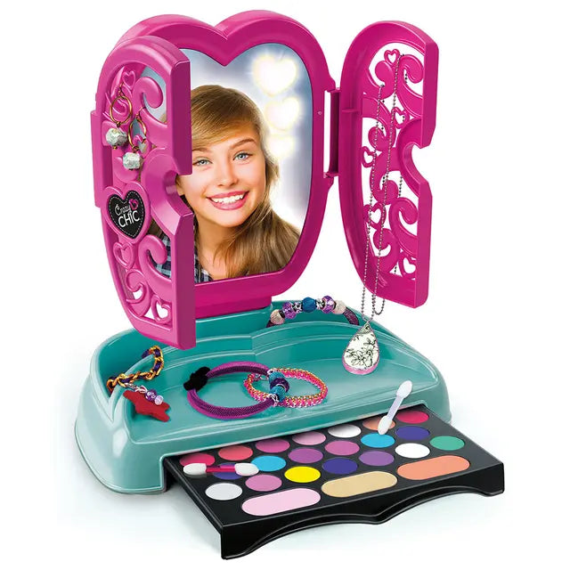 - منظم مكياج راقي مع أضواء مرآة أنيقة للغاية لعمل مكياج مثل فنان مكياج حقيقي. - يحتوي منظم المكياج على مجموعة غنية من مستحضرات التجميل مع ملمع الشفاه وظلال العيون وكريم الأساس. - لصنع مكياج مثل والدتك، يتم تضمين أداة وضع المكياج وإسفنجة أيضًا. - تعمل الأضواء عند فتح المرآة لخلق الجو المناسب وجعل لحظات اللعب أكثر متعة وجاذبية. - يمكن إزالتها بسهولة بالماء وهي مصنوعة من مواد غير سامة تم اختبارها وآمنة تمامًا. - مناسبة من عمر ست سنوات فما فوق.
