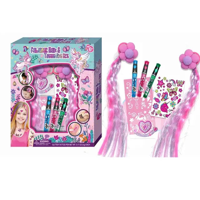 مجموعة إكسسوارات الشعر والتاتو الرائعة . - كل ما تحتاجة طفلتك لابتكار أسلوبها الخاص مع التاتو اللامع المرح. - تحتوي على: قطعتين من وصلات الشعر المزخرفة مع حامل شعر من الفرو ، 3 قطع من أقلام التاتو اللامعة. 1 ورقة من ملصقات التاتو اللامع و1 ورقة من الإستنسل التي يعاد استخدامها. - يطور الإبداع والخيال و آمن على البشرة. - مؤقت وسهل الإزالة بسهولة.