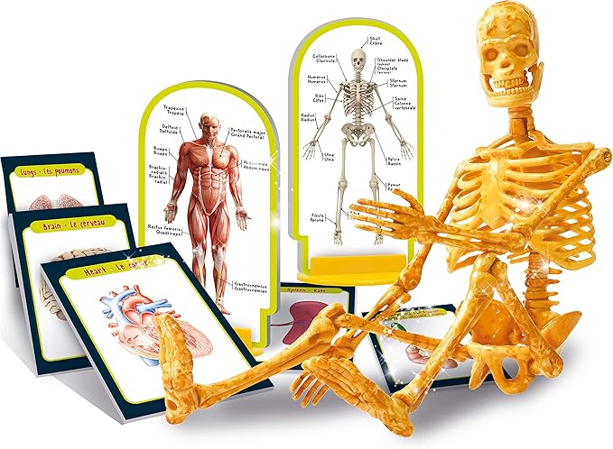 طقم علمي تفاعلي يعرّف الأطفال على تركيب جسم الإنسان بطريقة مبسطة وممتعة. يحتوي على مجسم للهيكل العظمي وبطاقات تعليمية تساعد الطفل على فهم العظام والأعضاء وأجزاء الجسم المختلفة خطوة بخطوة.