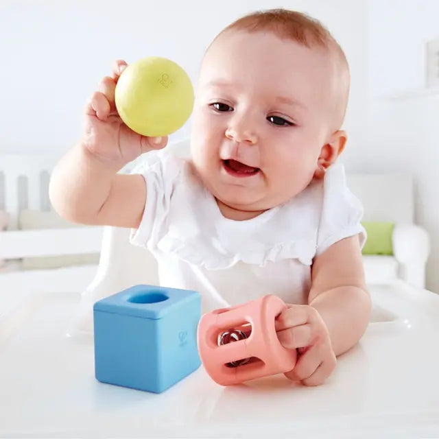 هزيها لتسلية رضيعك بالأصوات التي تصدرها الأشكال المختلفة. مع نمو طفلك، قومي بتشجيعه على تجربة أنشطة التكديس البسيط والتصنيف، واستمتعي بالنظر عبر عدسات الأشكال الملونة. مصنوعة من مواد أساسها الرز. مجموعة من 3 قطع