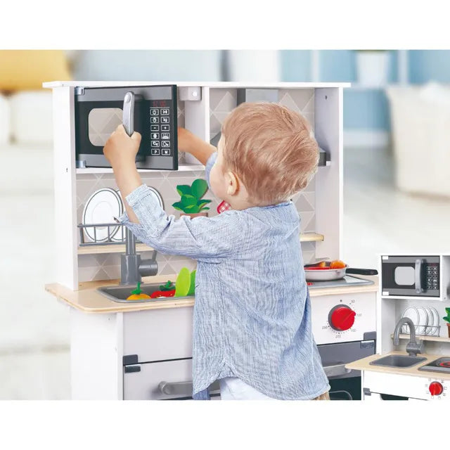 - لدى هيب مجموعة ممتعة من المطابخ والأجهزة والكثير والكثير من المأكولات اللذيذة. - تحسين المهارات الاجتماعية والتطور العاطفي والمهارات اللغوية في هذا الحلم متعدد الوظائف للمطبخ، تنجح كل وصفة على الفور. - نحن نعد! هدية مثالية للطفل الصغير وستوفر بالتأكيد ساعات لا نهاية لها من المرح. - يتميز بموقد إلكتروني مضيء ومؤثرات صوتية واقعية للطهي. - مع صنبور دوار وميكروويف وخلفية مصورة. - تحتوي على مقلاة وملعقة معدنية واحدة.