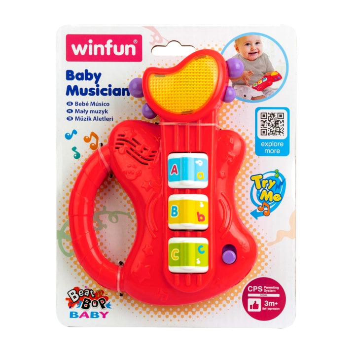 يقدم الغيتار المضيء مفهوم التعلم المبكر تقدم أزرار Strum A-B-C النوتات الموسيقية والألحان المبهجة مفتاح تشغيل / إيقاف ومقبض مدمج