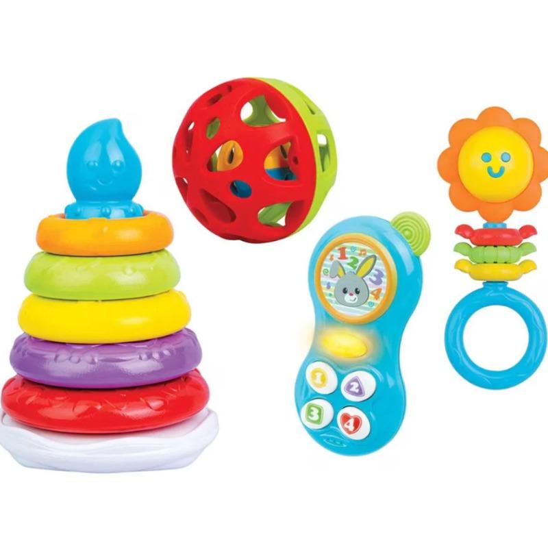 - كرة الخشخيشة: قم بهزها أو دحرجتها أو رميها لإصدار أصوات خشخشة جميلة. - 5 حلقات ملونة وقاعدة من البوليستر من أجل حركة متذبذبة. - هاتف الطفل: أصوات ممتعة، وألحان، وضوء وامض وعضاضة. - خشخيشة الزهور: قم بهزها للحصول على أصوات خشخشة، وعضاضات لتهدئة لثة الطفل. - مناسبة من عمر شهر فما فوق.