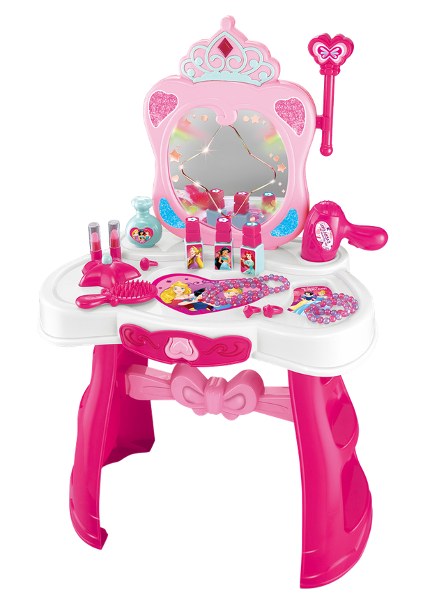 مجموعة ألعاب مركز تجميل مع ضوء وموسيقى من ديزني برينسيس. - مجموعة لعب ديزني برينسيس بيوتي سنتر مع إكسسوارات مرآة بالضوء والصوت ستحبها طفلتك وتقضي وقتها بالمرح والتزين. - تحتوي على 1 مجفف شعر و 1 مشط و 2 أحمر شفاه و 3 حلقات و 4 أساور و 4 طلاء أظافر. - قم بتلويح العصا السحرية إلى المرآة واستمتع بالضوء والصوت الملونين. - تتضمن هذه المجموعة مجموعة متنوعة من الملحقات اللطيفة والمحبوبة. - تساعد في تنمية مهارات طفلتك الحركية والمهارية. - الابعاد التقريبية: 40 x 28 x 67 سم. - الفئة العمرية المناسبة: 5-3 سنوات.
