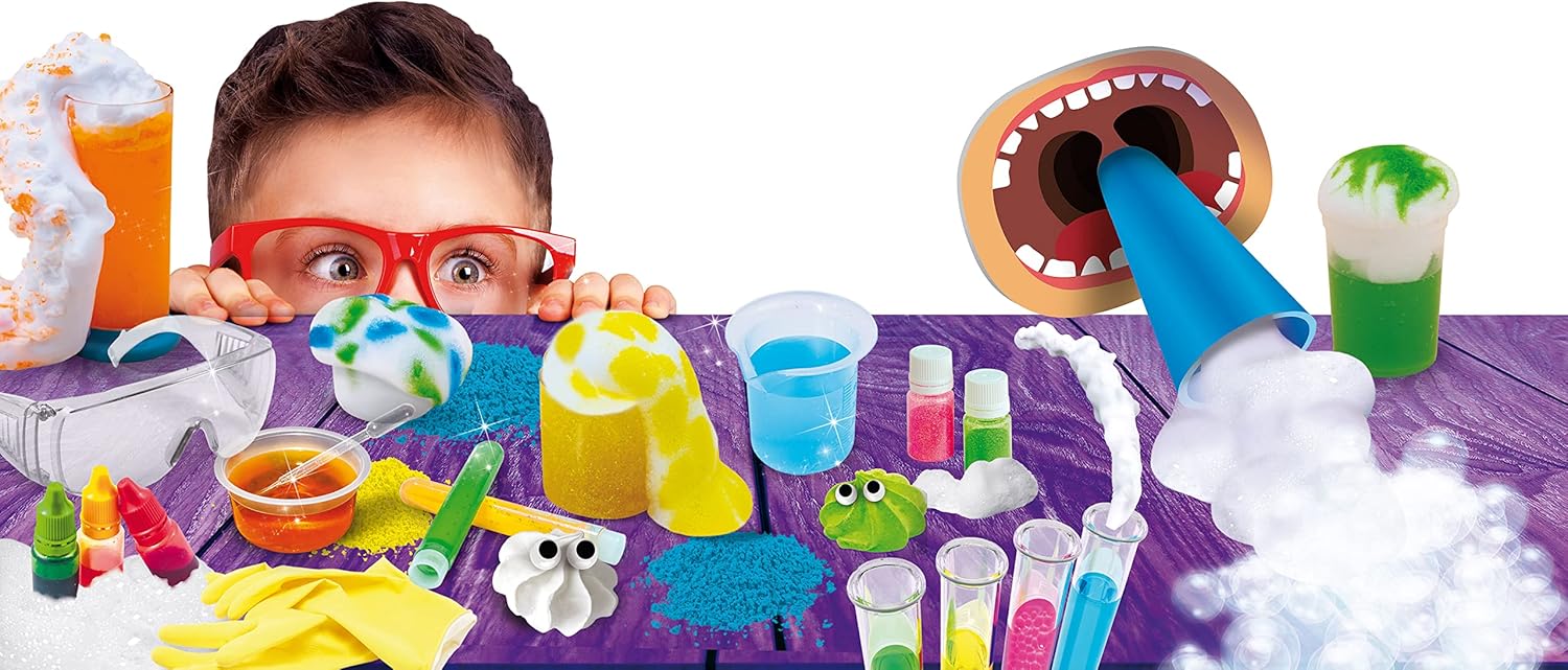 تحتوي على أدوات ومواد ملوّنة لإجراء تجارب متنوعة تنتج رغوة بأشكال وألوان مختلفة دون فوضى أو تناثر مزعج.